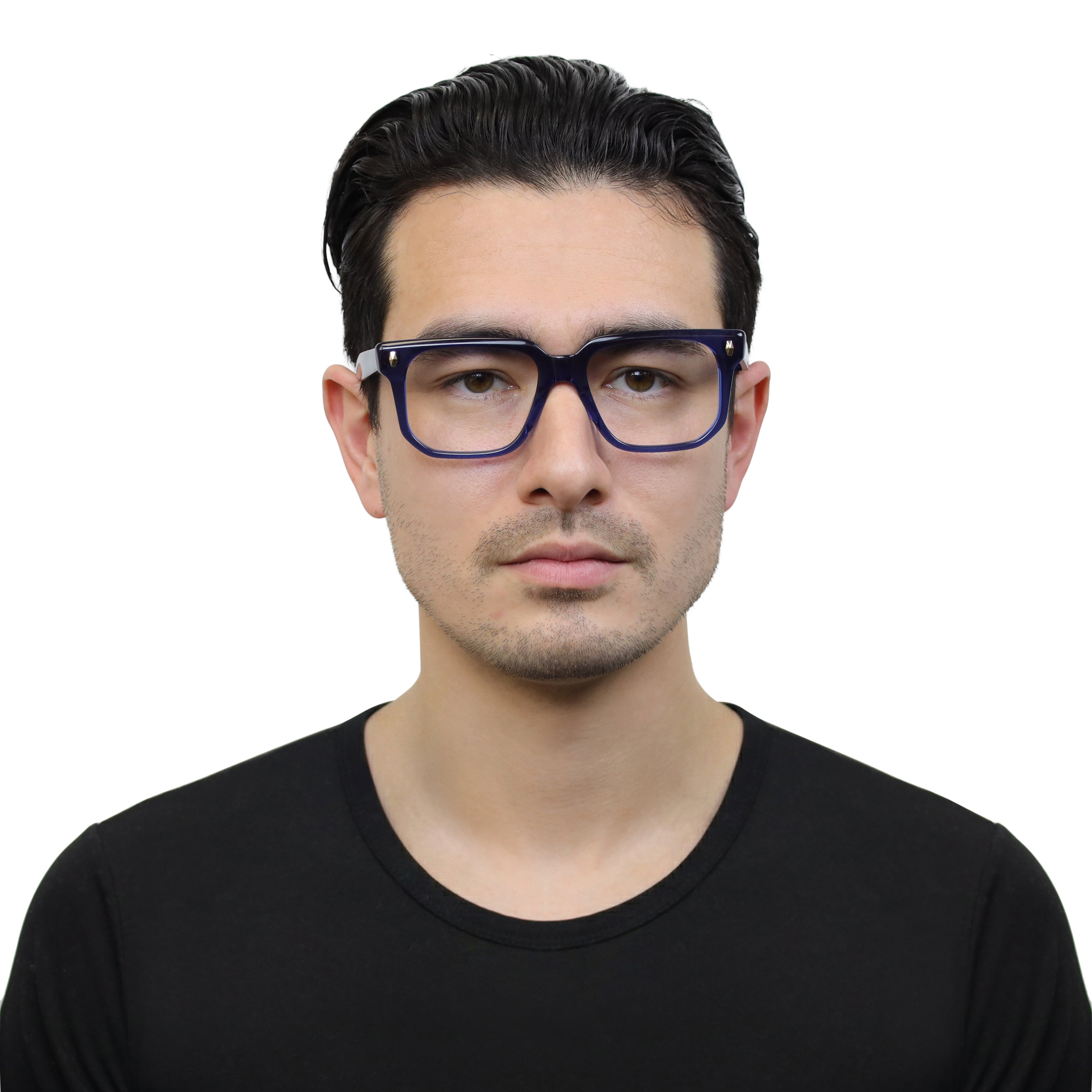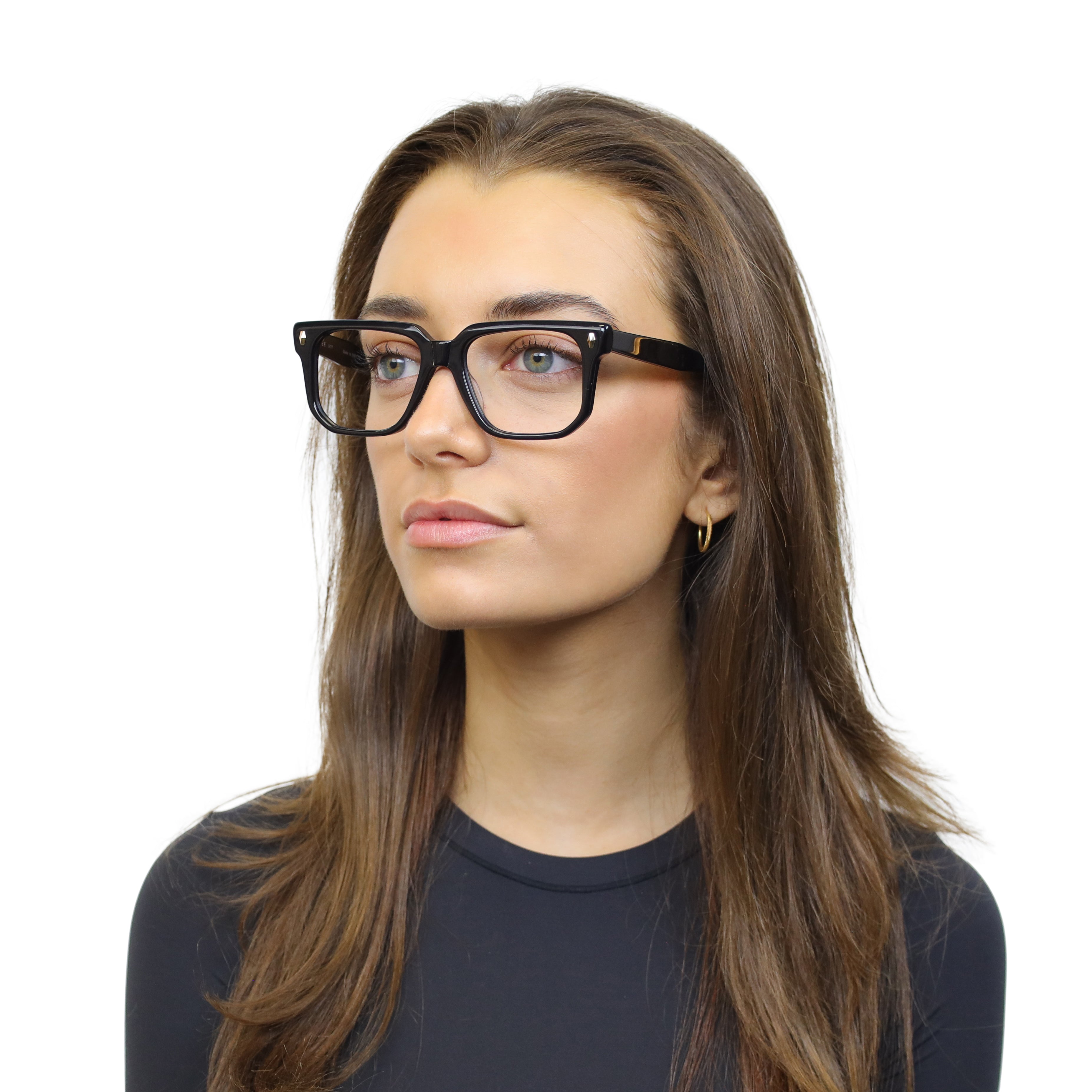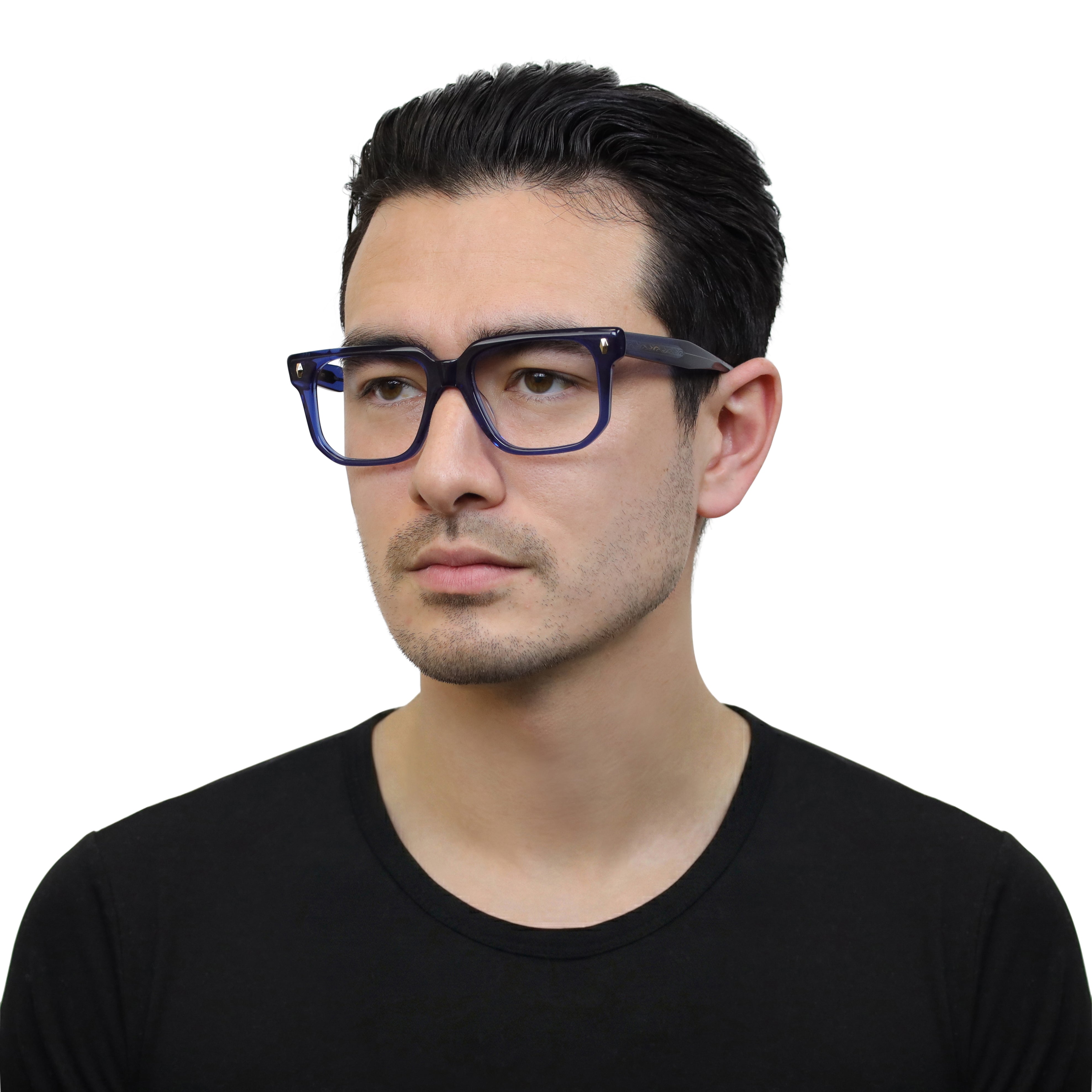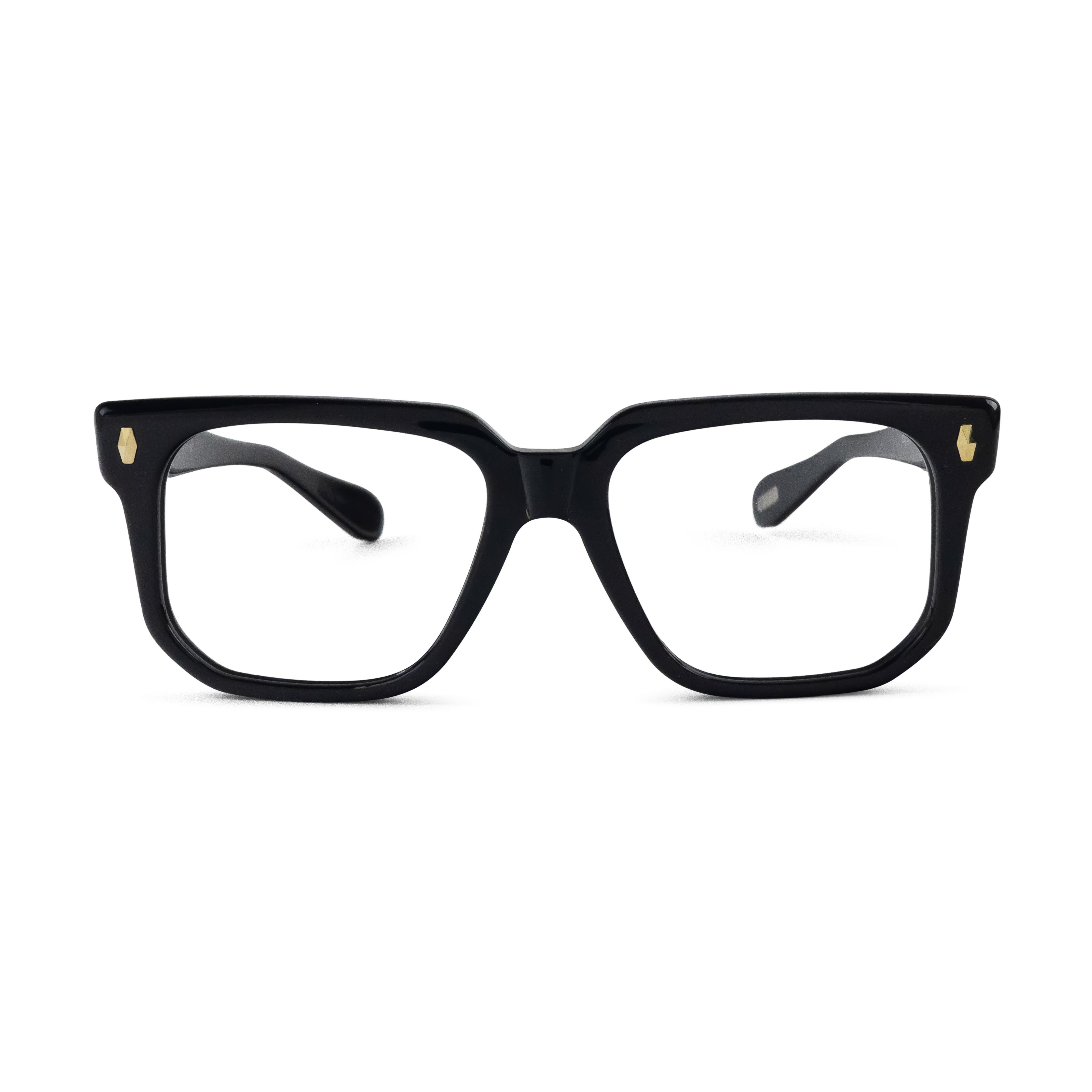 Classic at first glance, interesting up close. This square acetate frame pairs crisp lines with polished rivets and an angular lower eye wire for a look that’s subtle… but never boring. Effortless style with character.