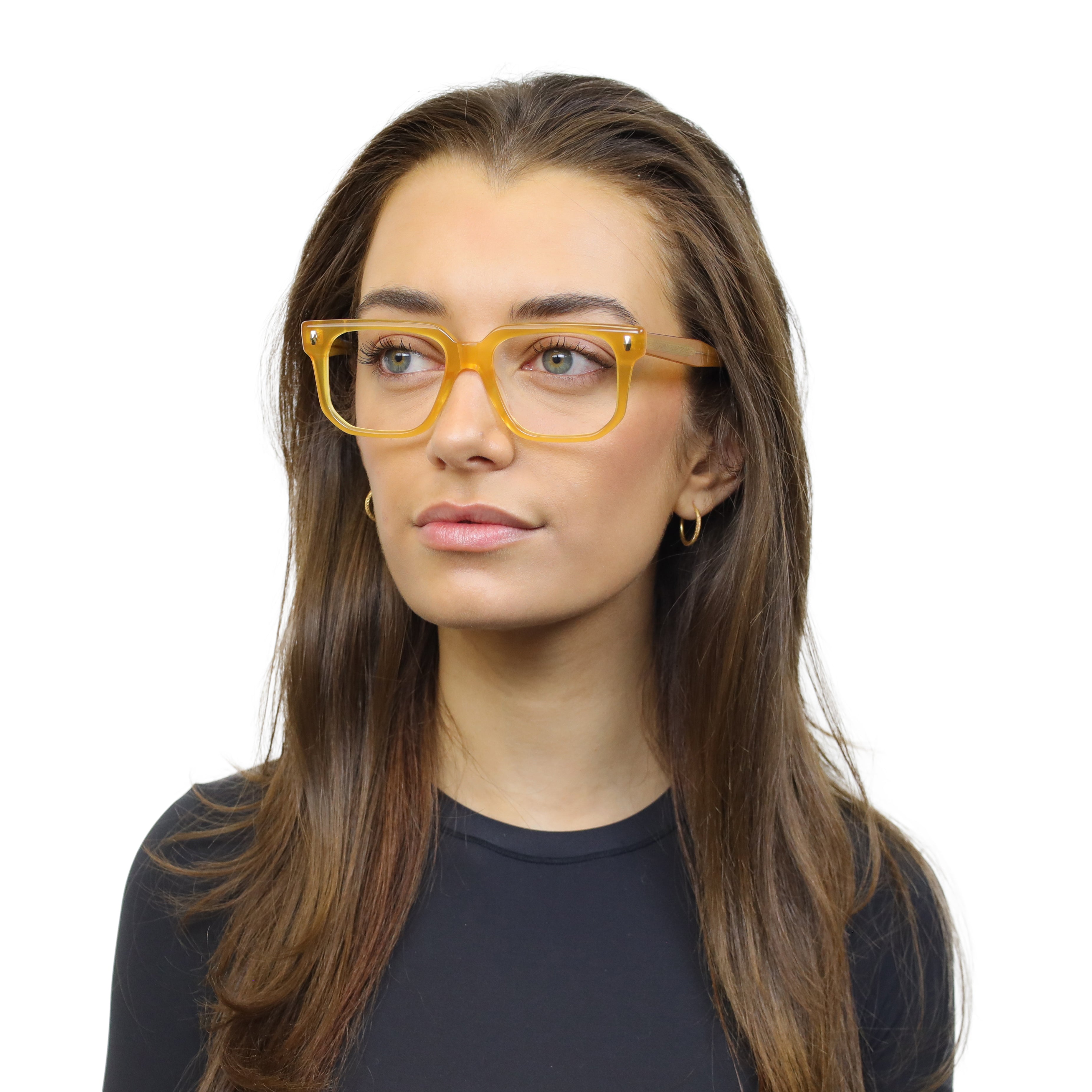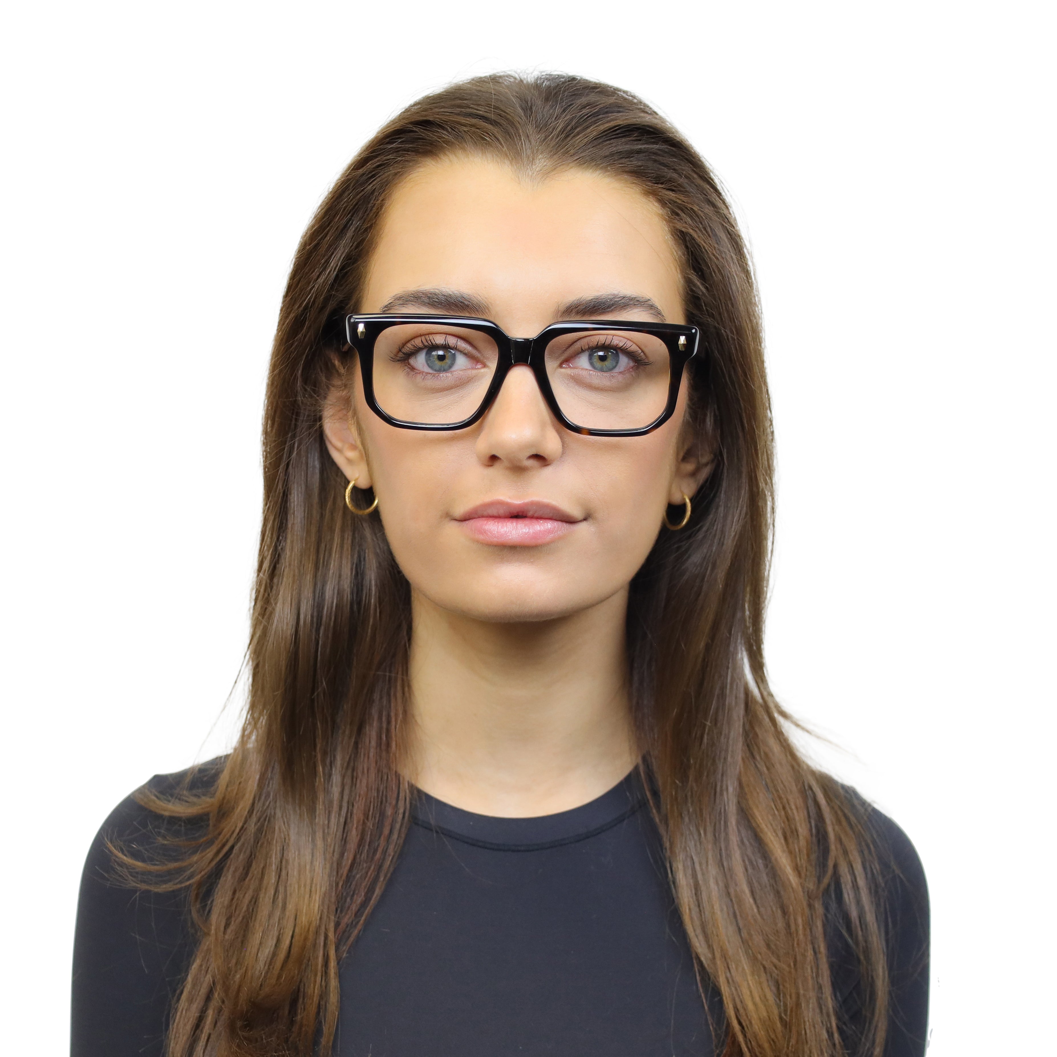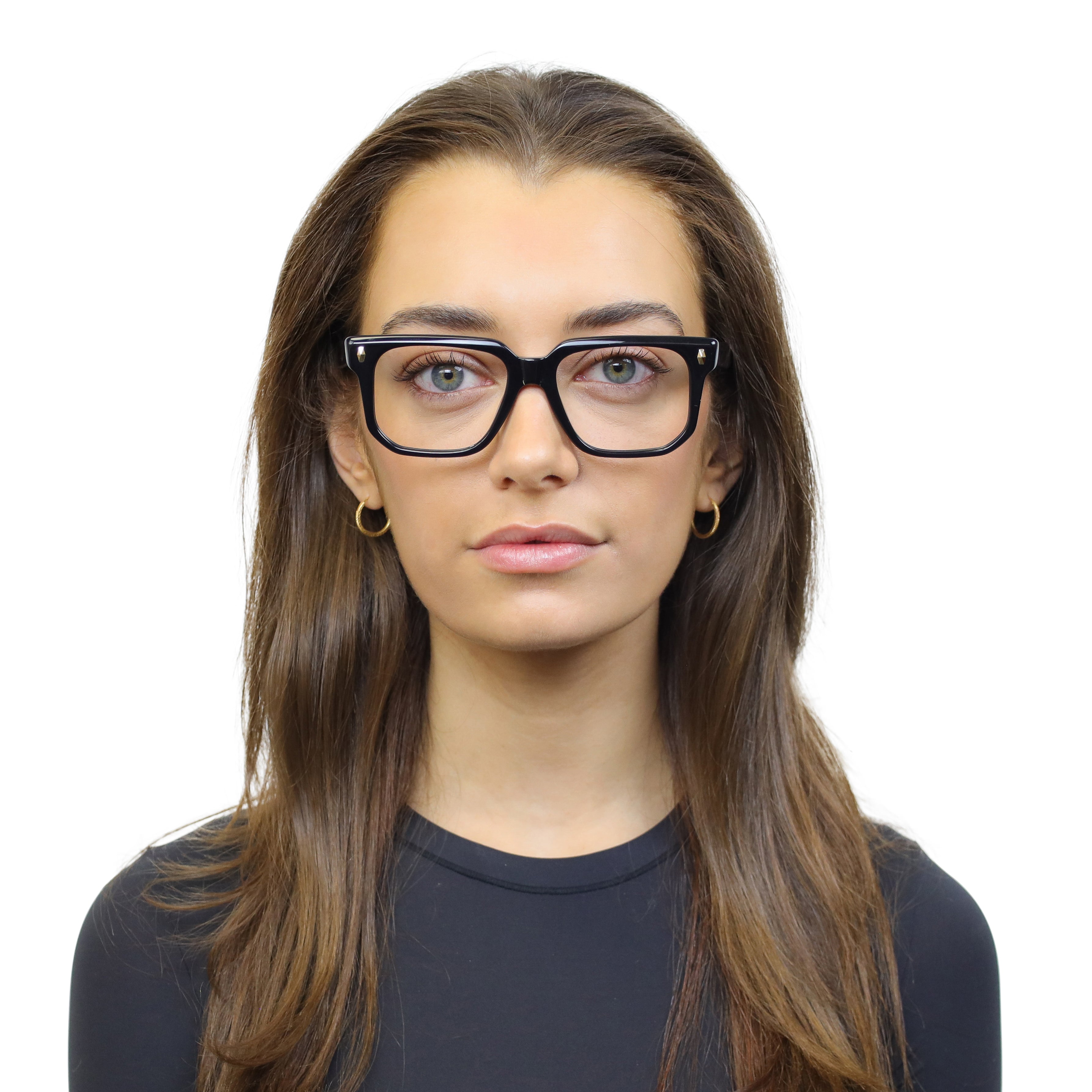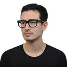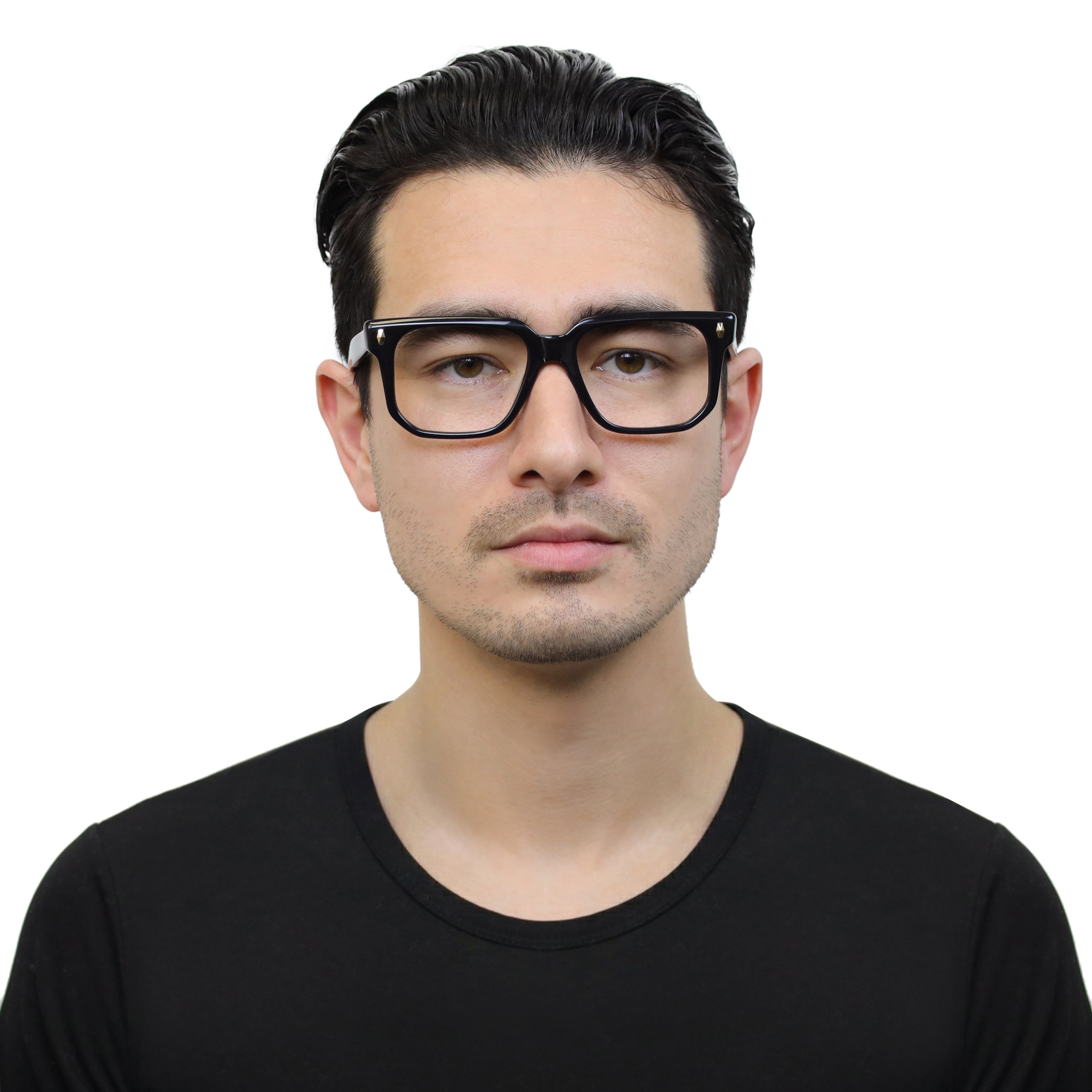 Classic at first glance, interesting up close. This square acetate frame pairs crisp lines with polished rivets and an angular lower eye wire for a look that’s subtle… but never boring. Effortless style with character.