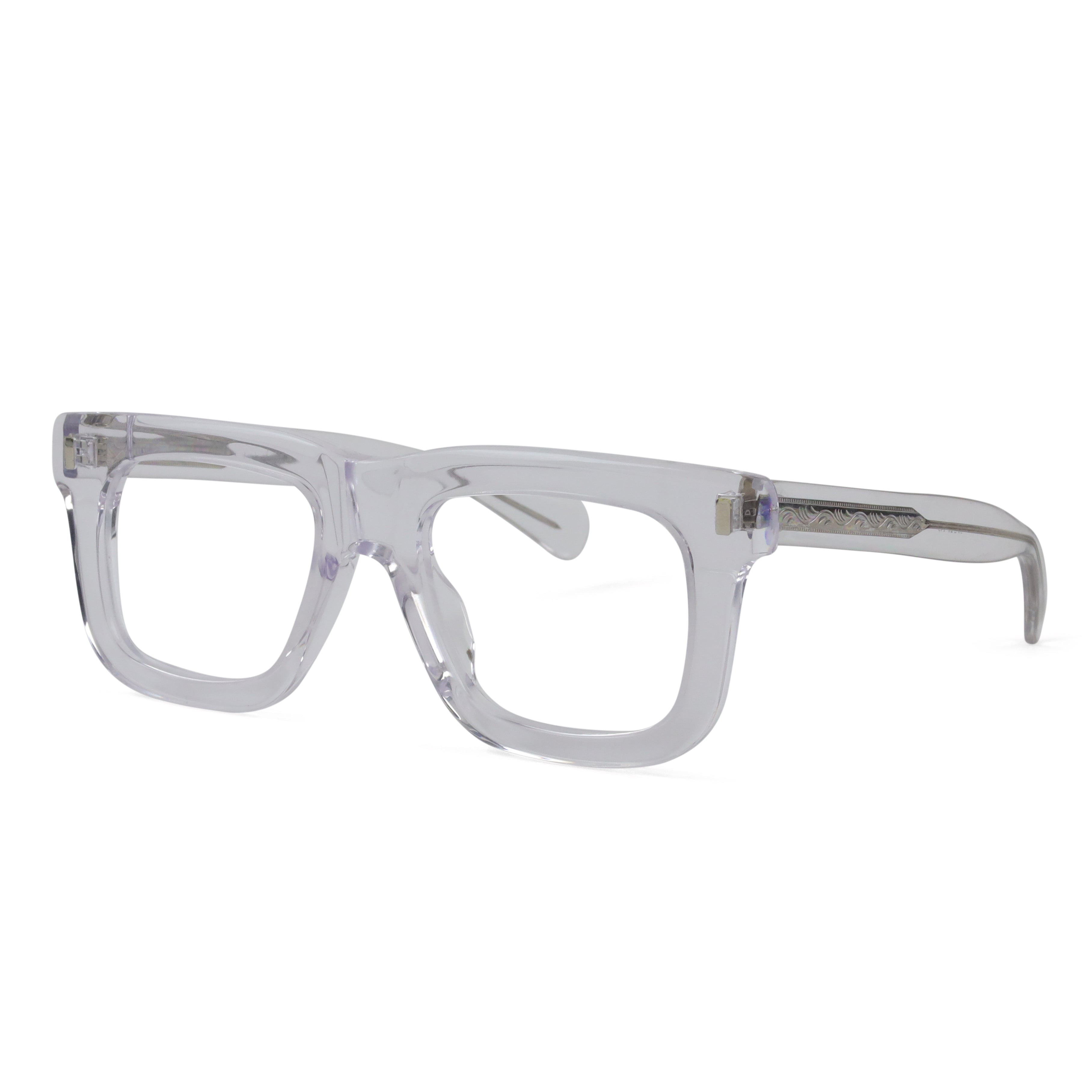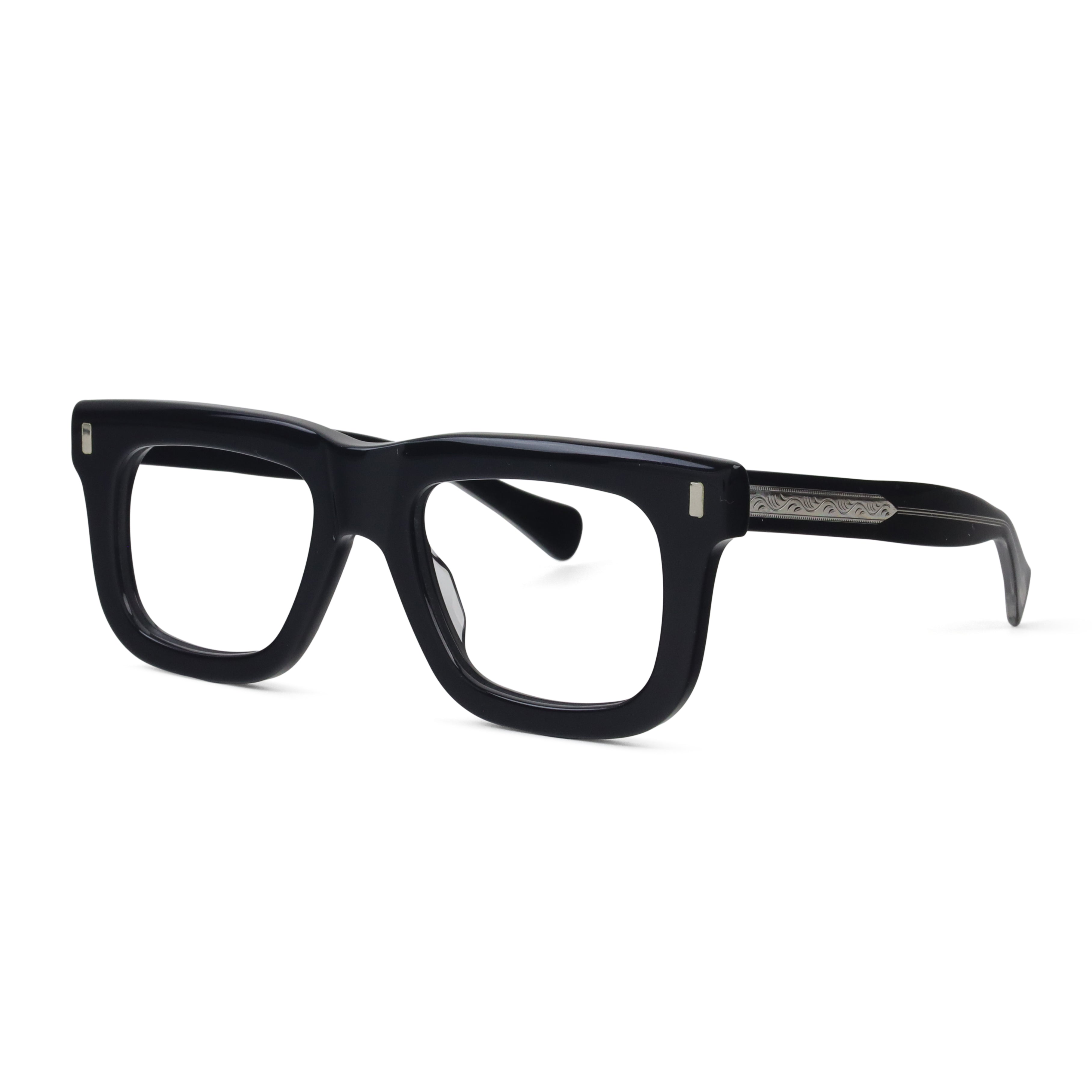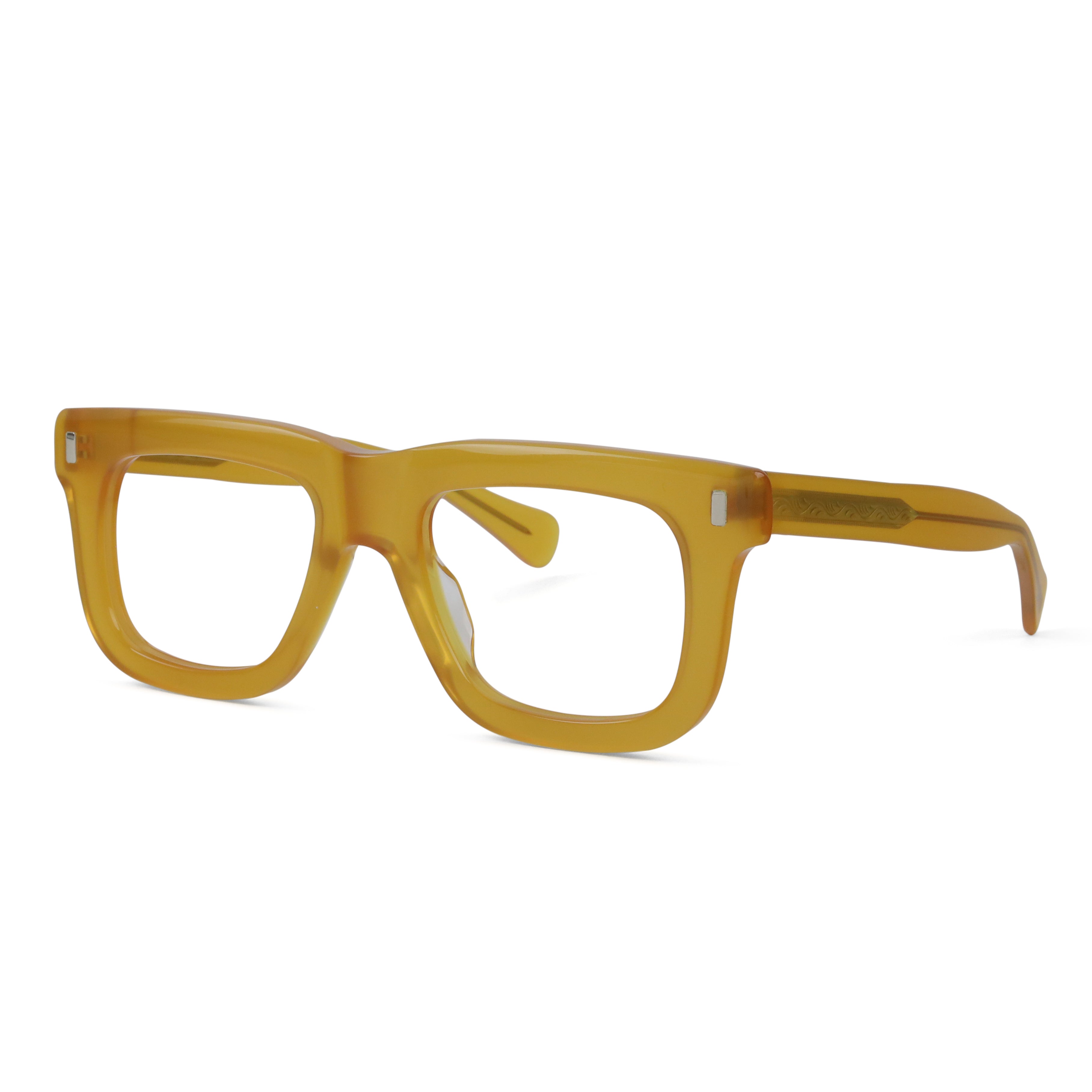 A bold flat-top that doesn’t blend in. The chunky acetate, exposed core wire, and vertical rivets give this frame a confident edge — equal parts vintage attitude and modern cool. If subtle isn’t your thing, this one speaks up for you.