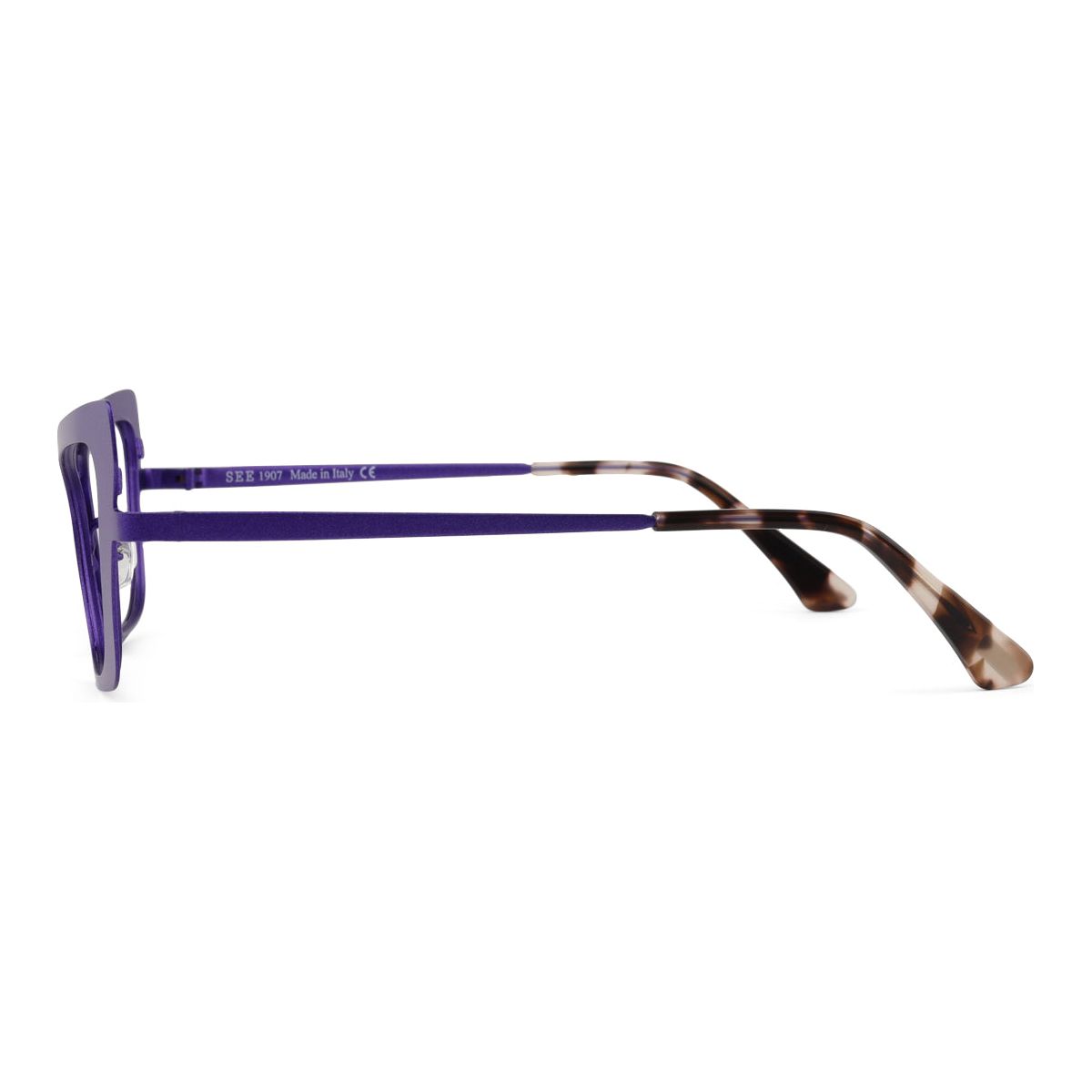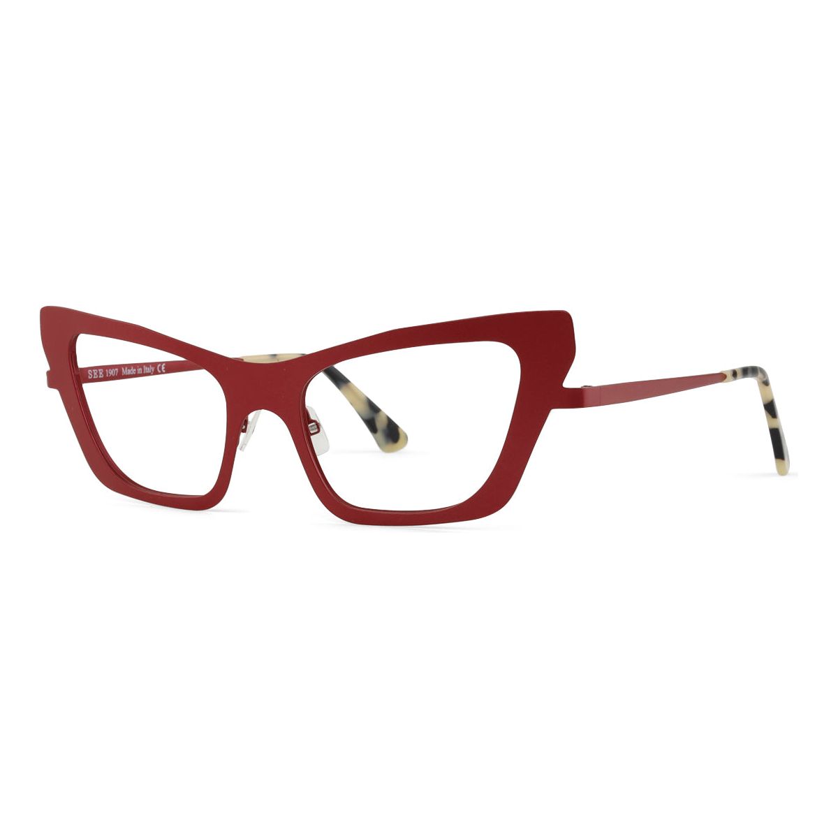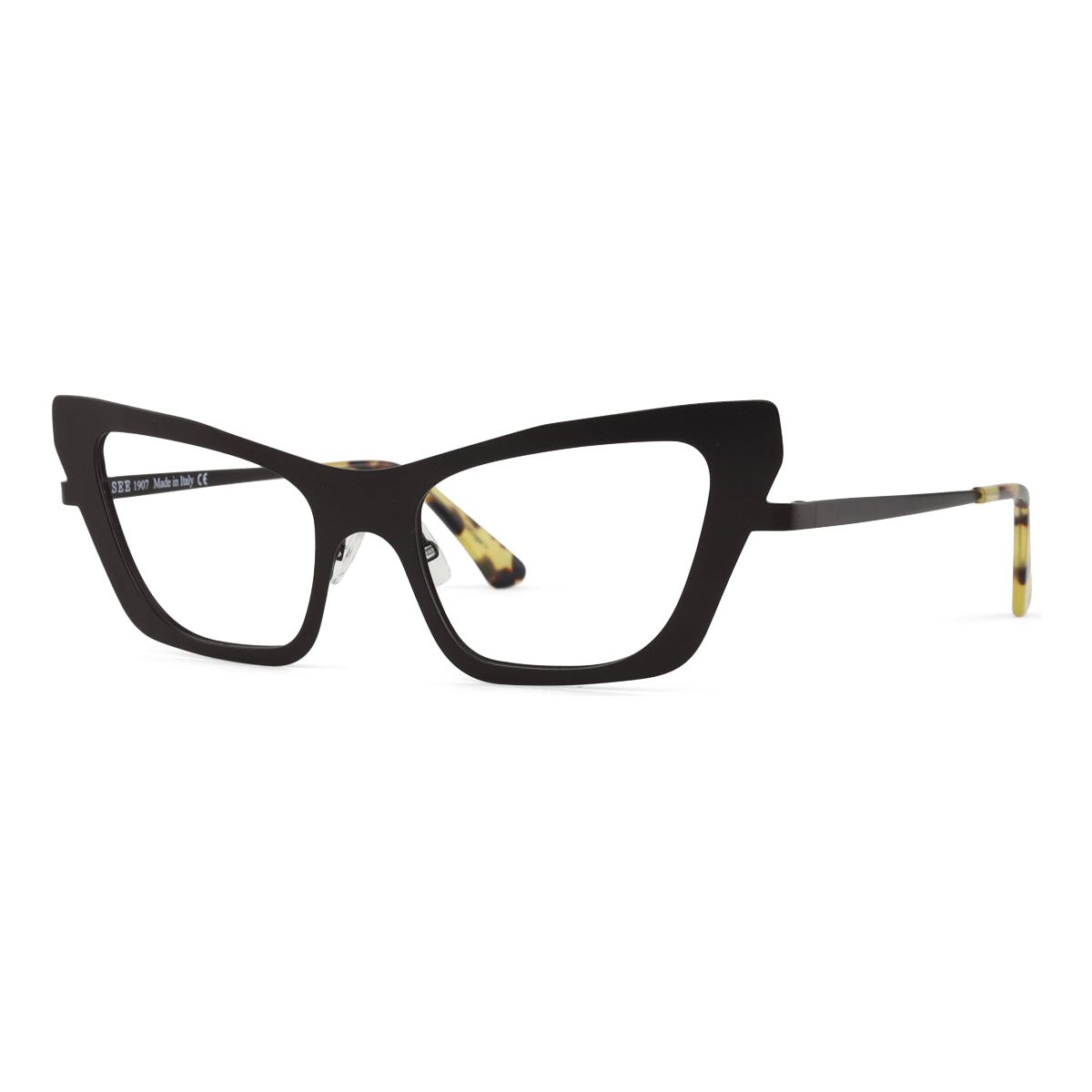 You eyewear aficionados will have a field day with SEE 1907. The exaggerated and angular cat-eye shape is handcrafted from custom-colored metal and comes equipped with contrasting acetate temples to seal the deal, ensuring a comfy fit for all-day wear.